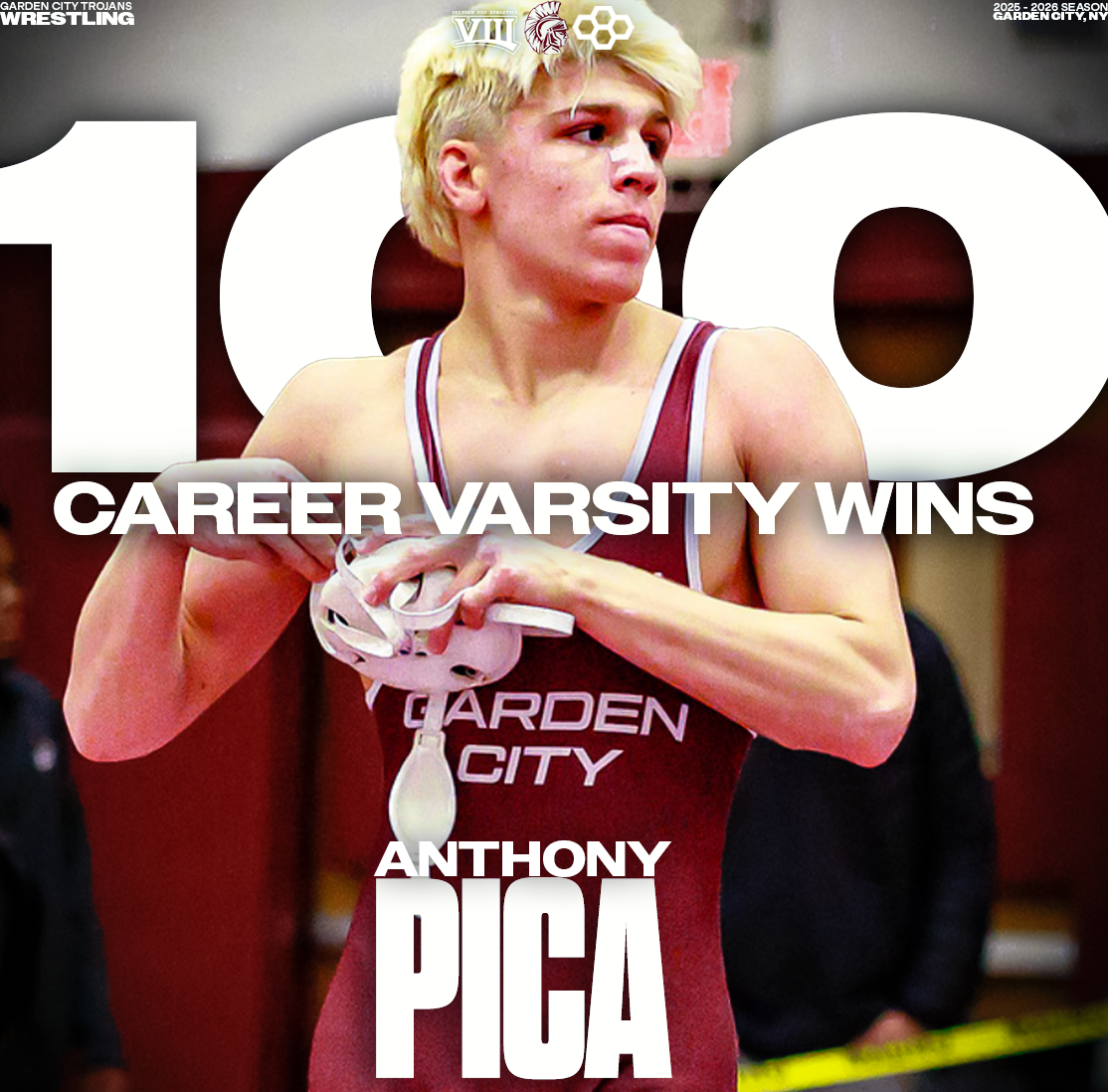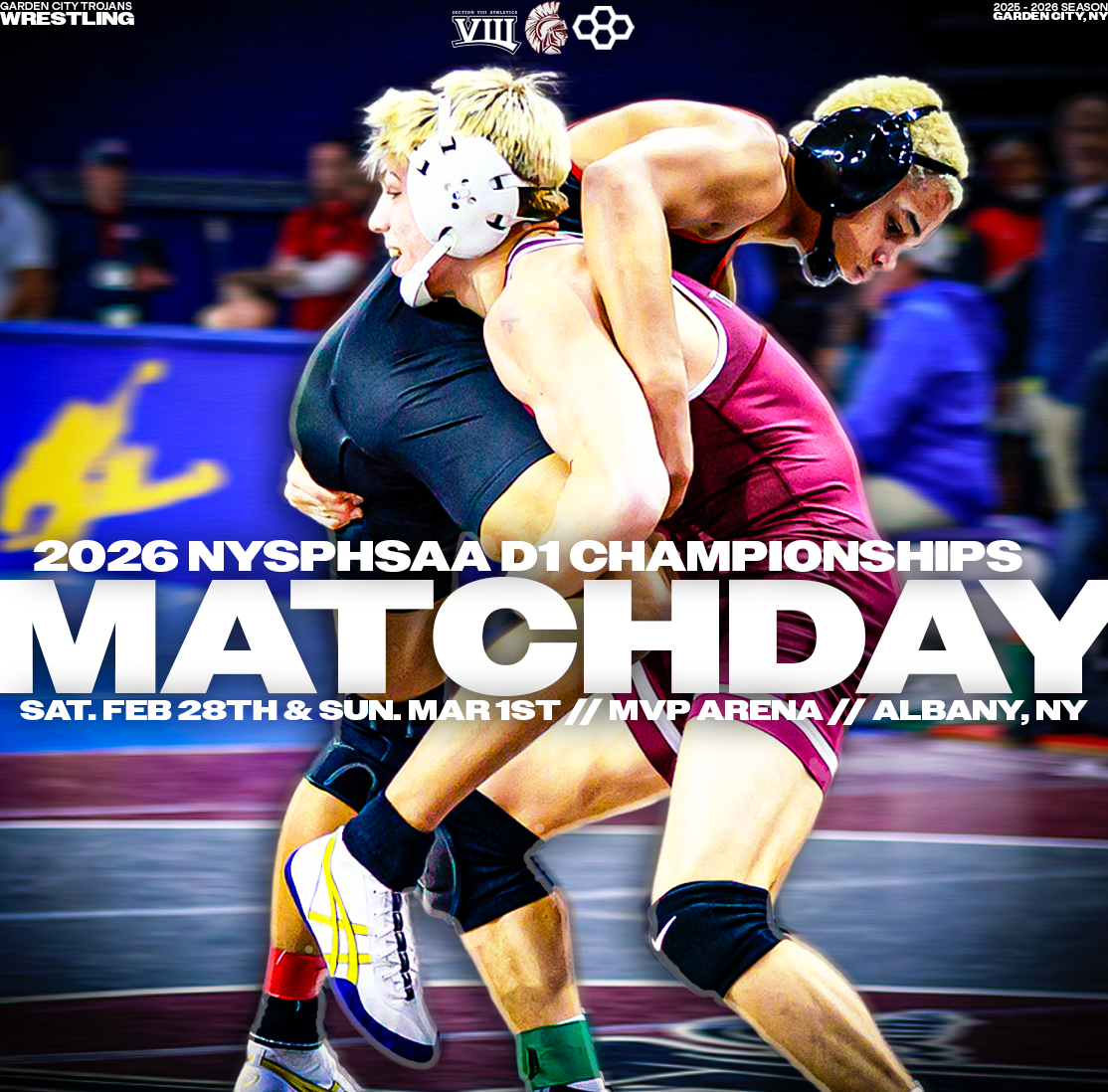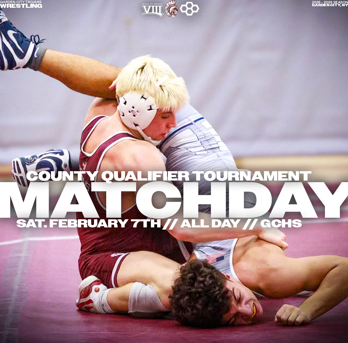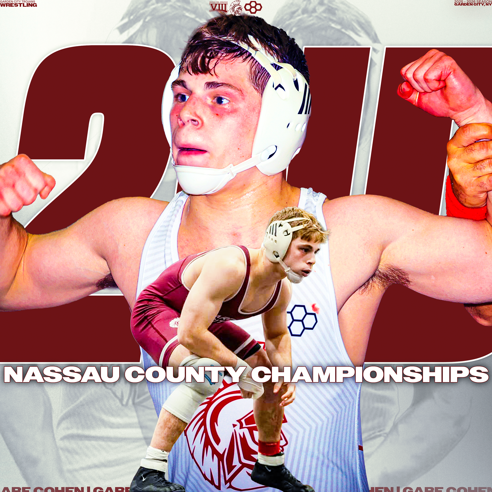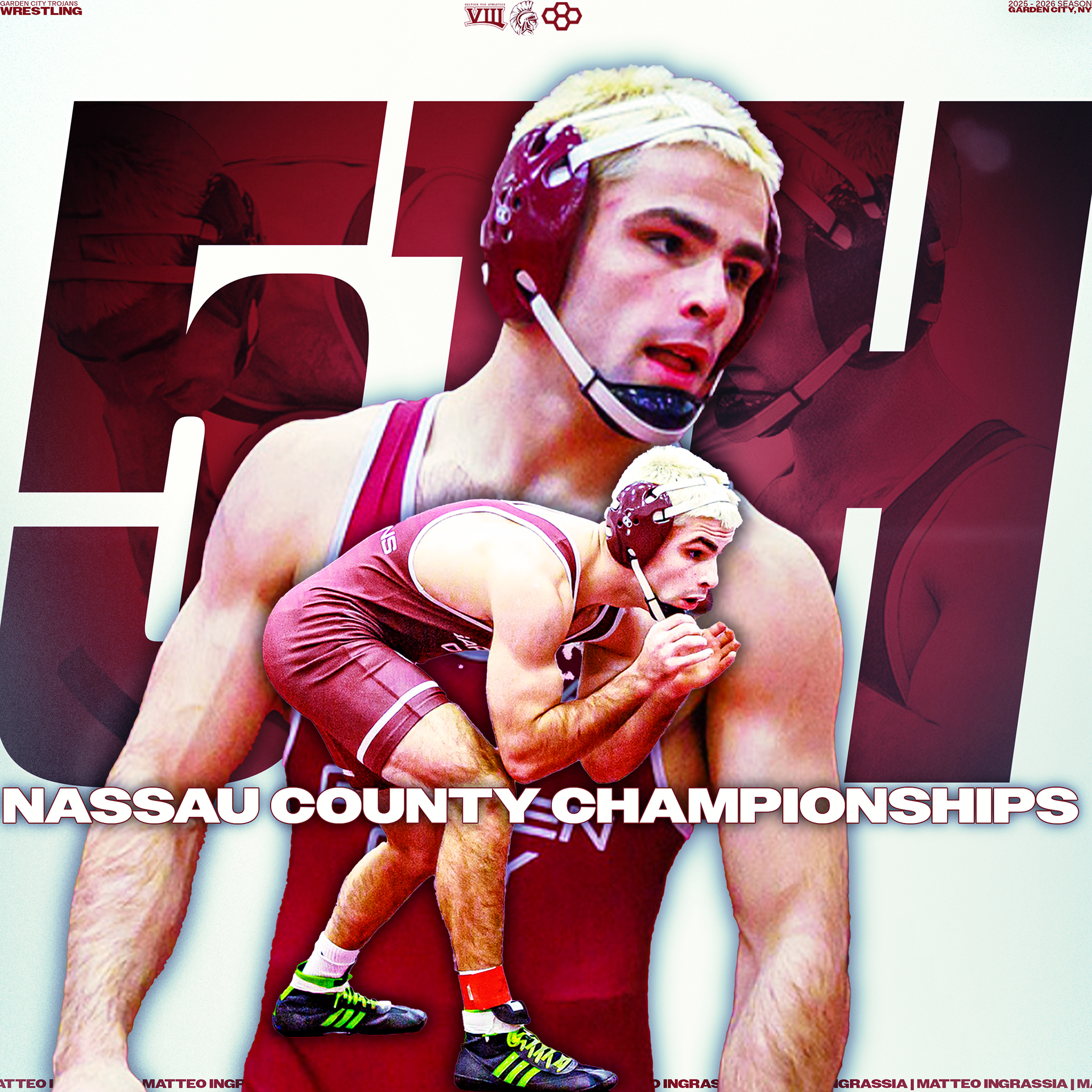 Explore a collection of social media graphics produced for the Garden City Trojans Wrestling team during the 2025-2026 season. The team made an appearance in the 2026 Nassau County Dual Meet Quarterfinals and had three All-County wrestlers: Seniors Anthony Pica & Gabe Cohen, and Junior Matteo Ingrassia. The Trojans are coached by second-year Head Coach Steve Jones and assisted by Matt Rich, James Murphy, Brad Hepworth, Michael Curiel, and Jayson Rivera.