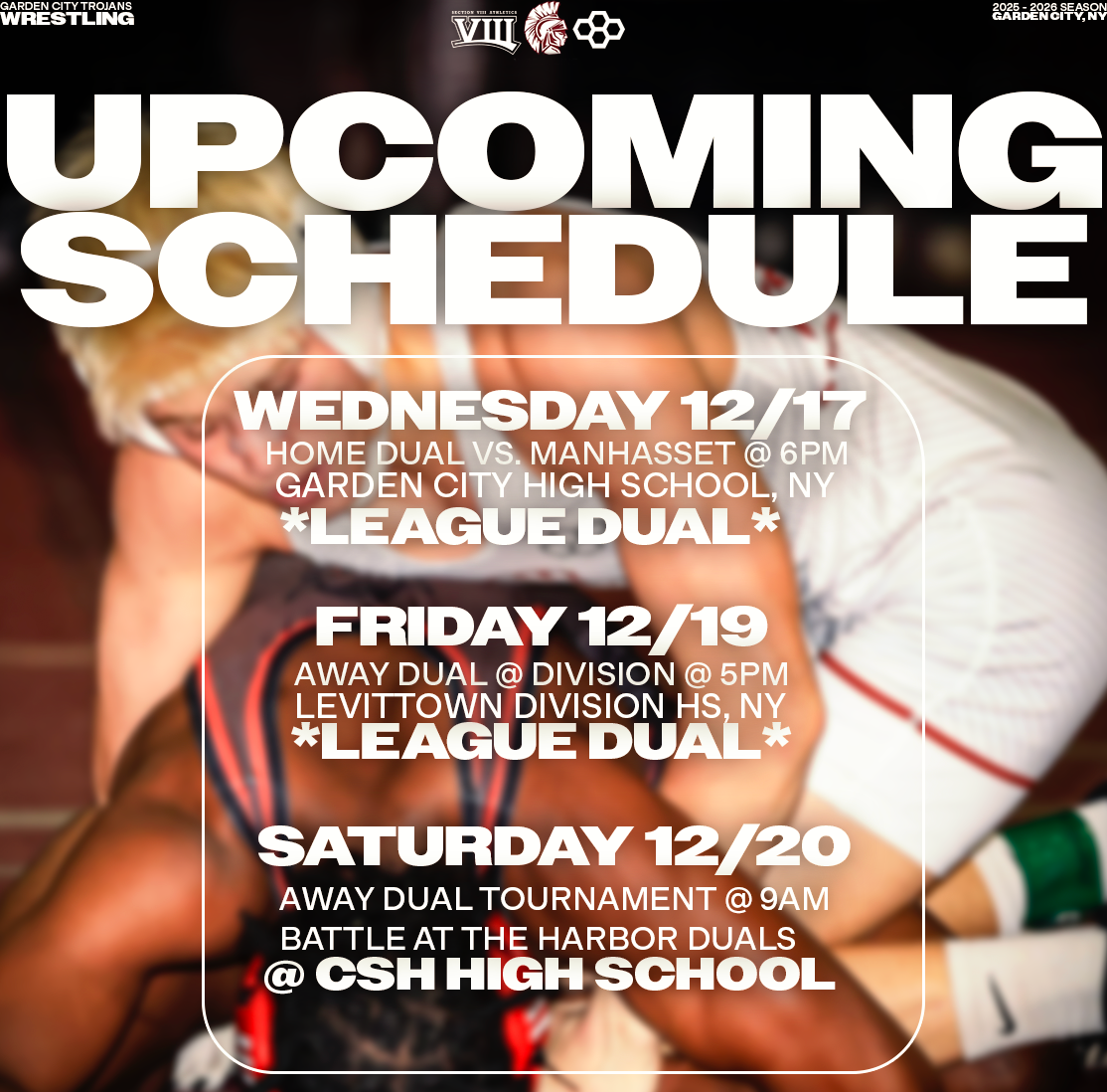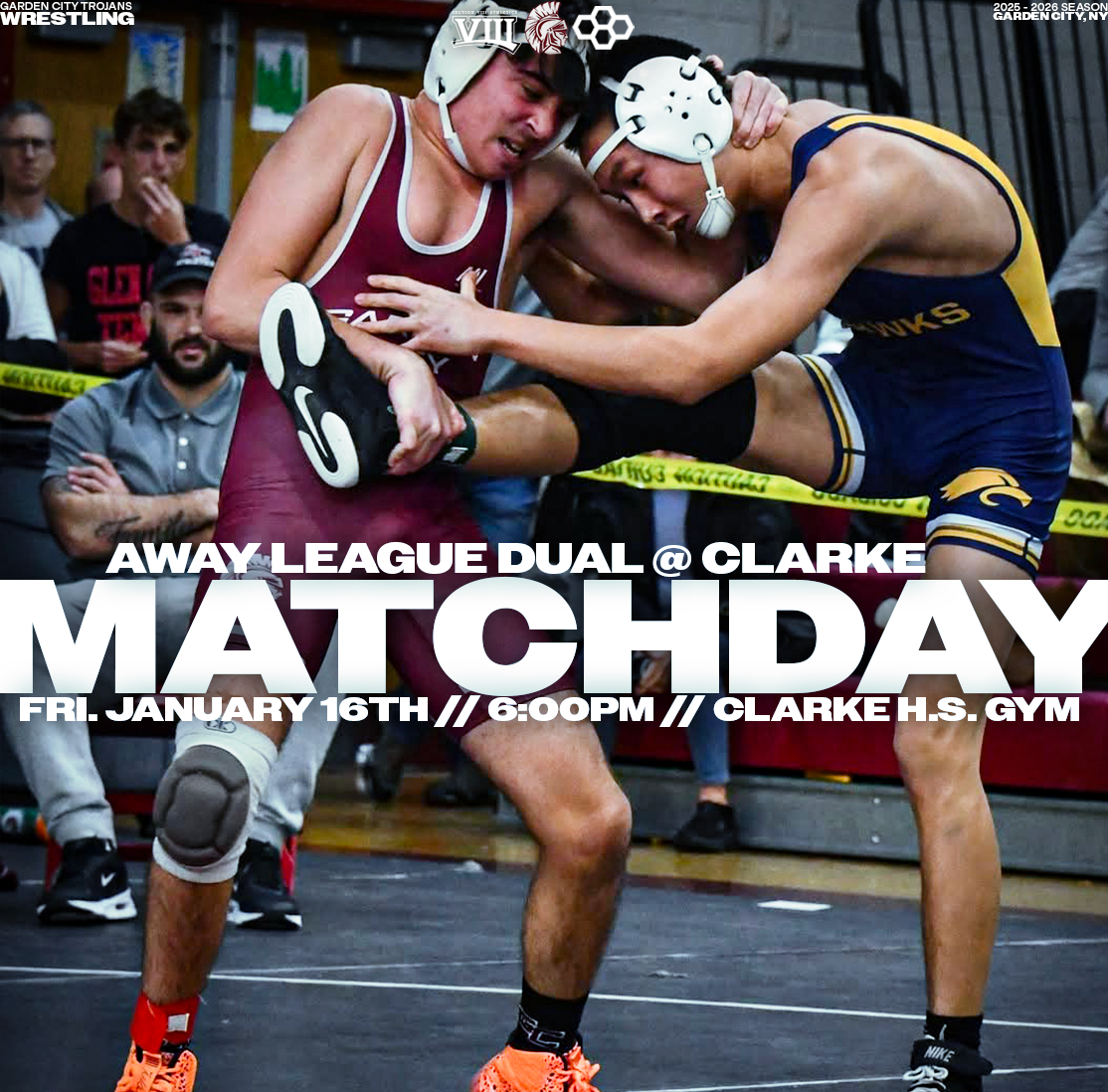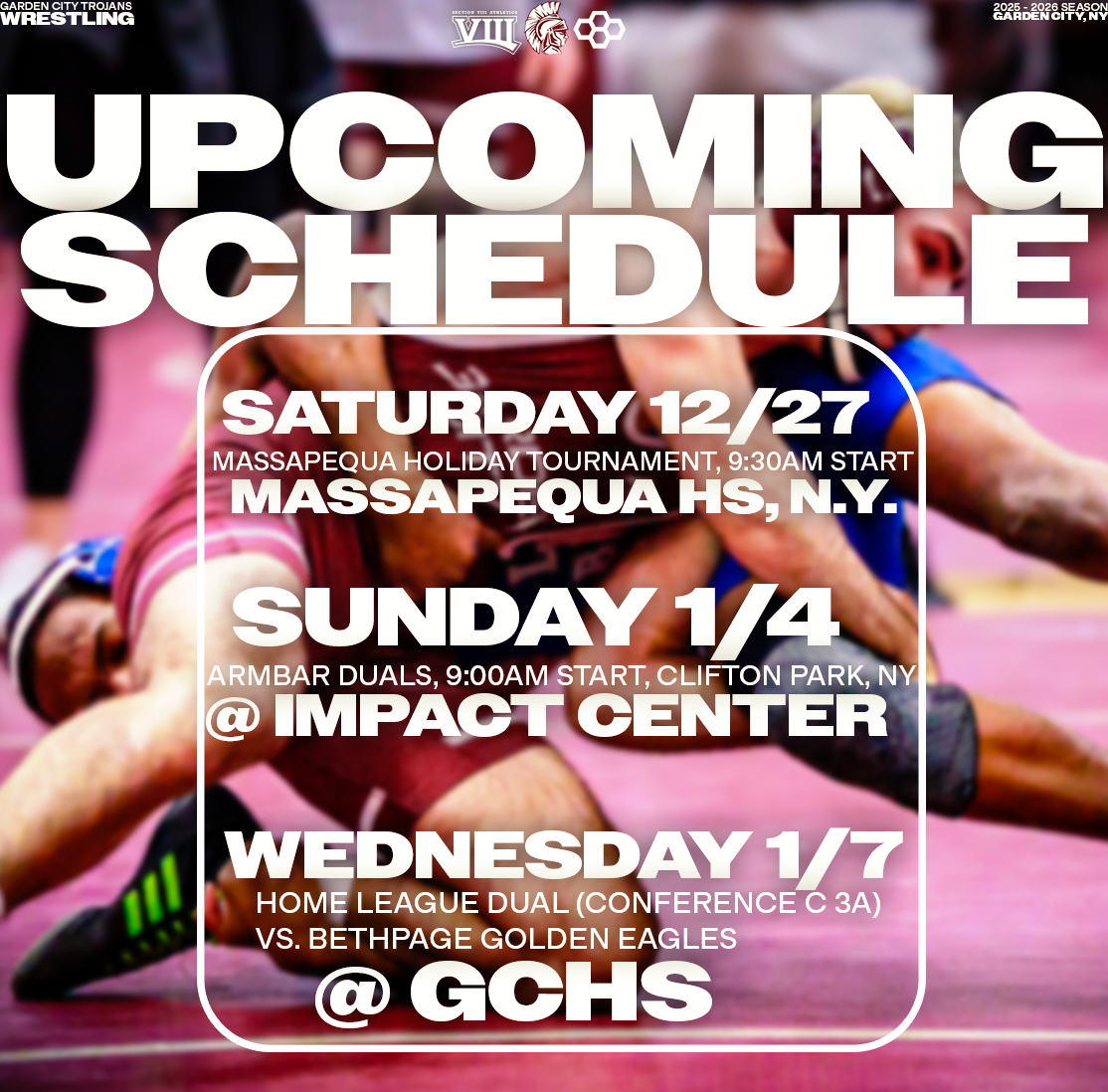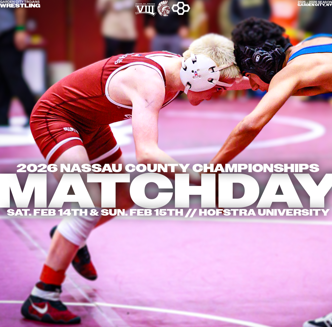 Explore a collection of social media graphics produced for the Garden City Trojans Wrestling team during the 2025-2026 season. The team made an appearance in the 2026 Nassau County Dual Meet Quarterfinals and had three All-County wrestlers: Seniors Anthony Pica & Gabe Cohen, and Junior Matteo Ingrassia. The Trojans are coached by second-year Head Coach Steve Jones and assisted by Matt Rich, James Murphy, Brad Hepworth, Michael Curiel, and Jayson Rivera.
