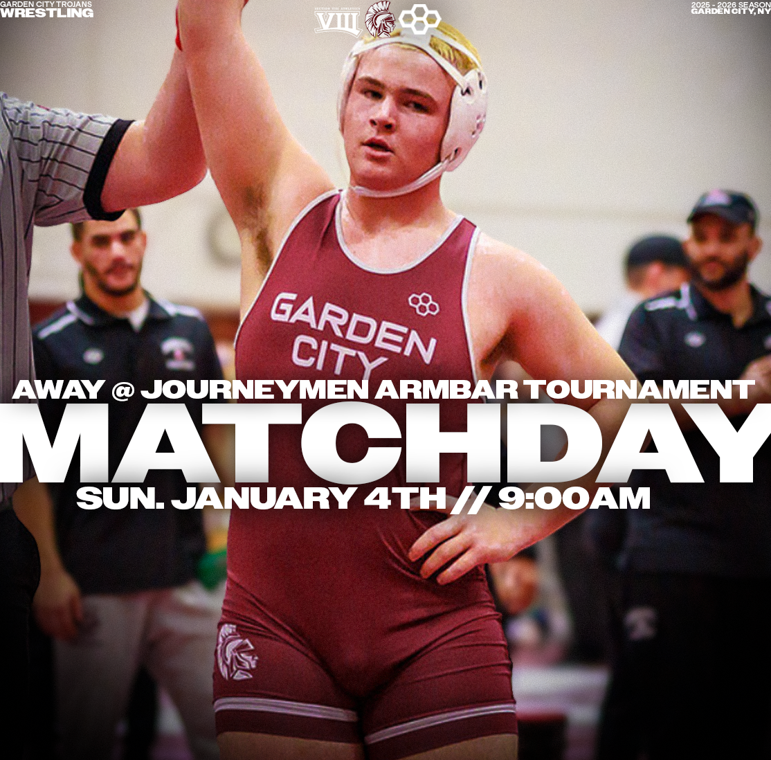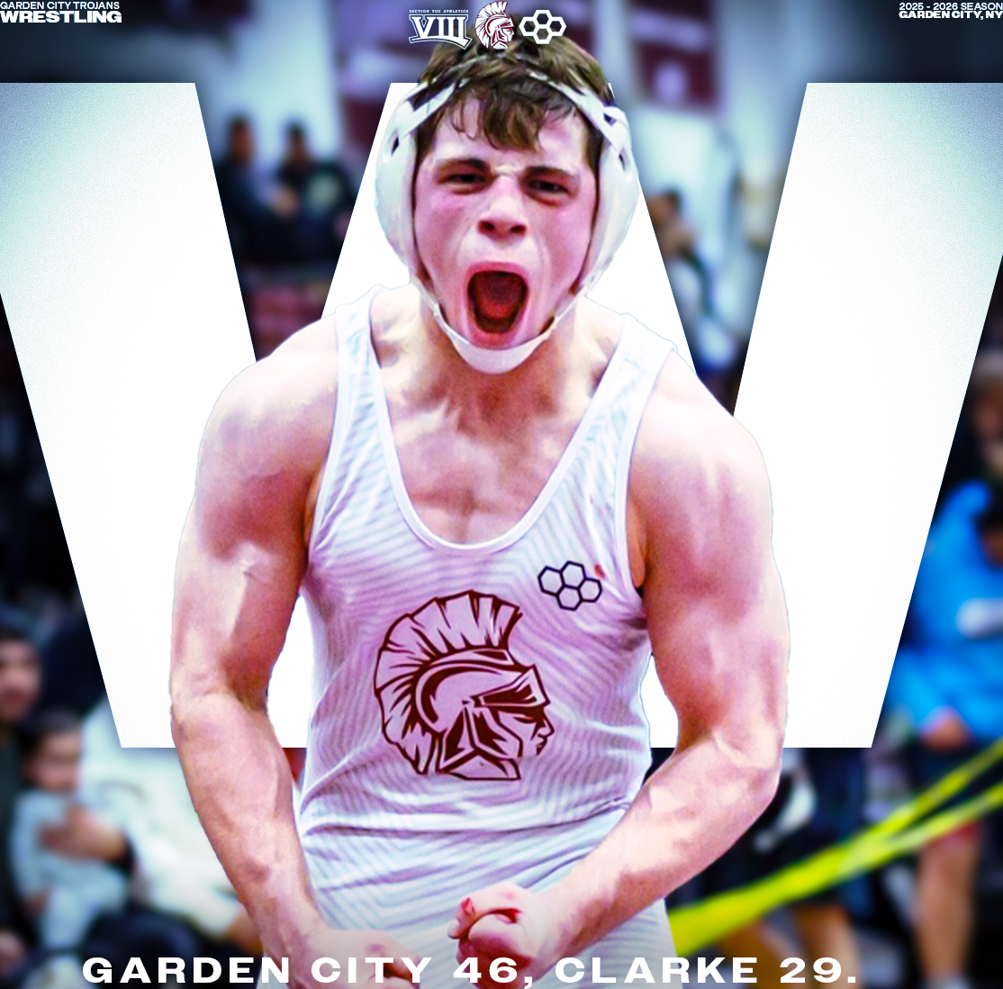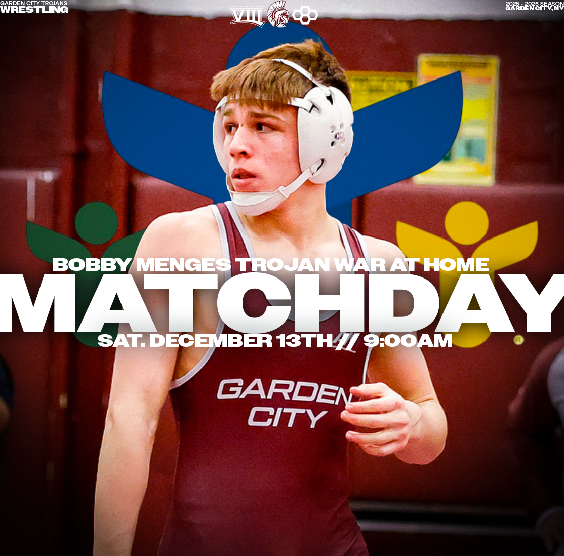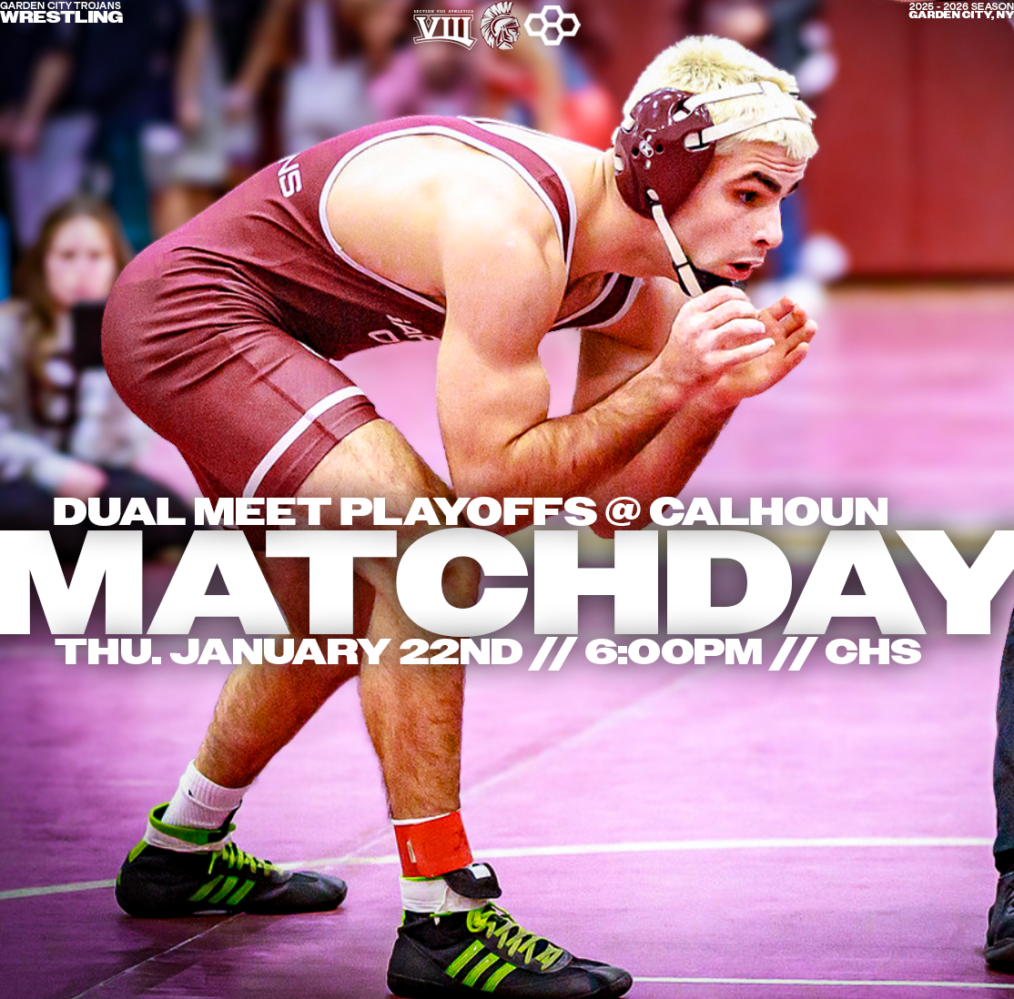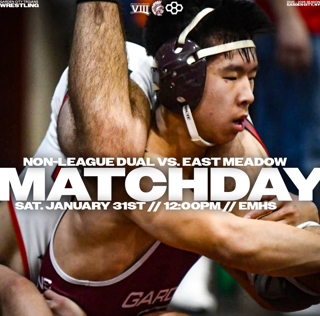 Explore a collection of social media graphics produced for the Garden City Trojans Wrestling team during the 2025-2026 season. The team made an appearance in the 2026 Nassau County Dual Meet Quarterfinals and had three All-County wrestlers: Seniors Anthony Pica & Gabe Cohen, and Junior Matteo Ingrassia. The Trojans are coached by second-year Head Coach Steve Jones and assisted by Matt Rich, James Murphy, Brad Hepworth, Michael Curiel, and Jayson Rivera.