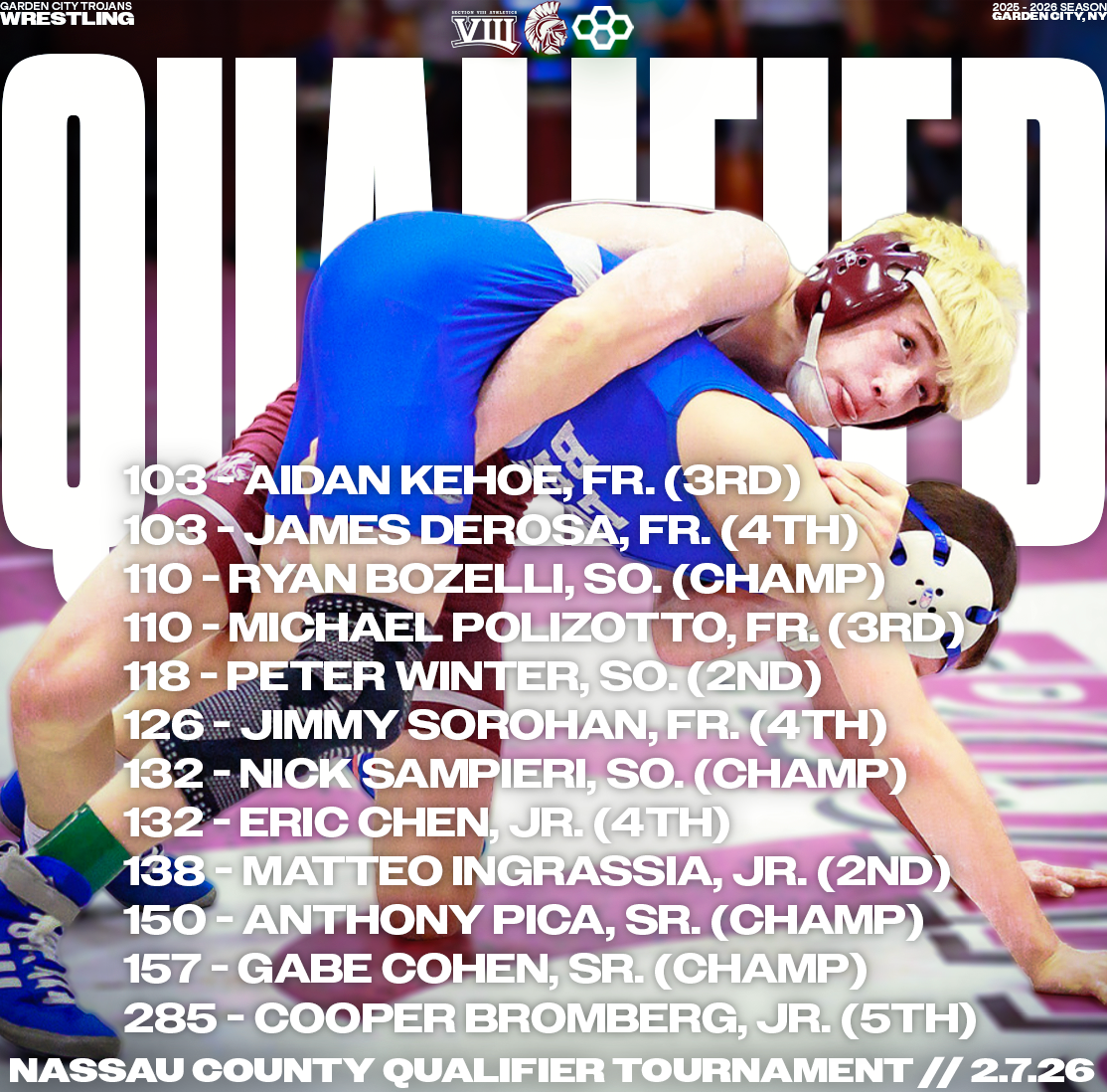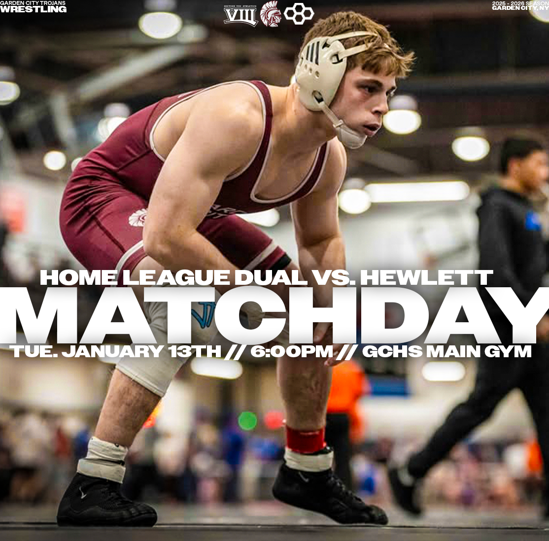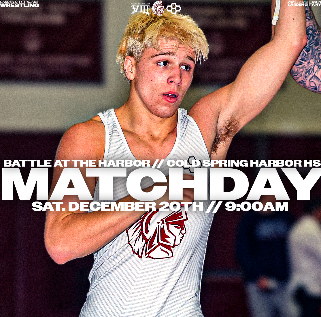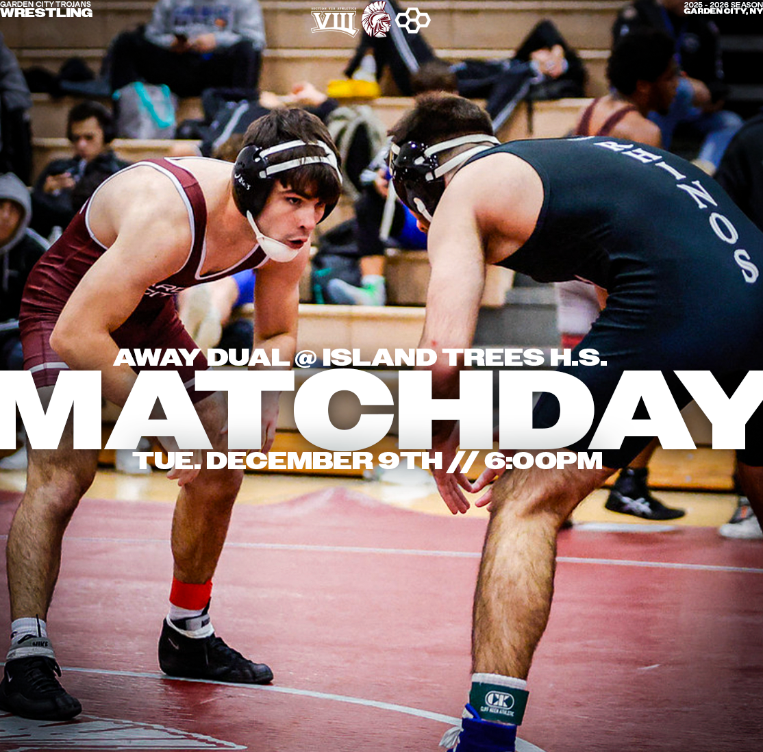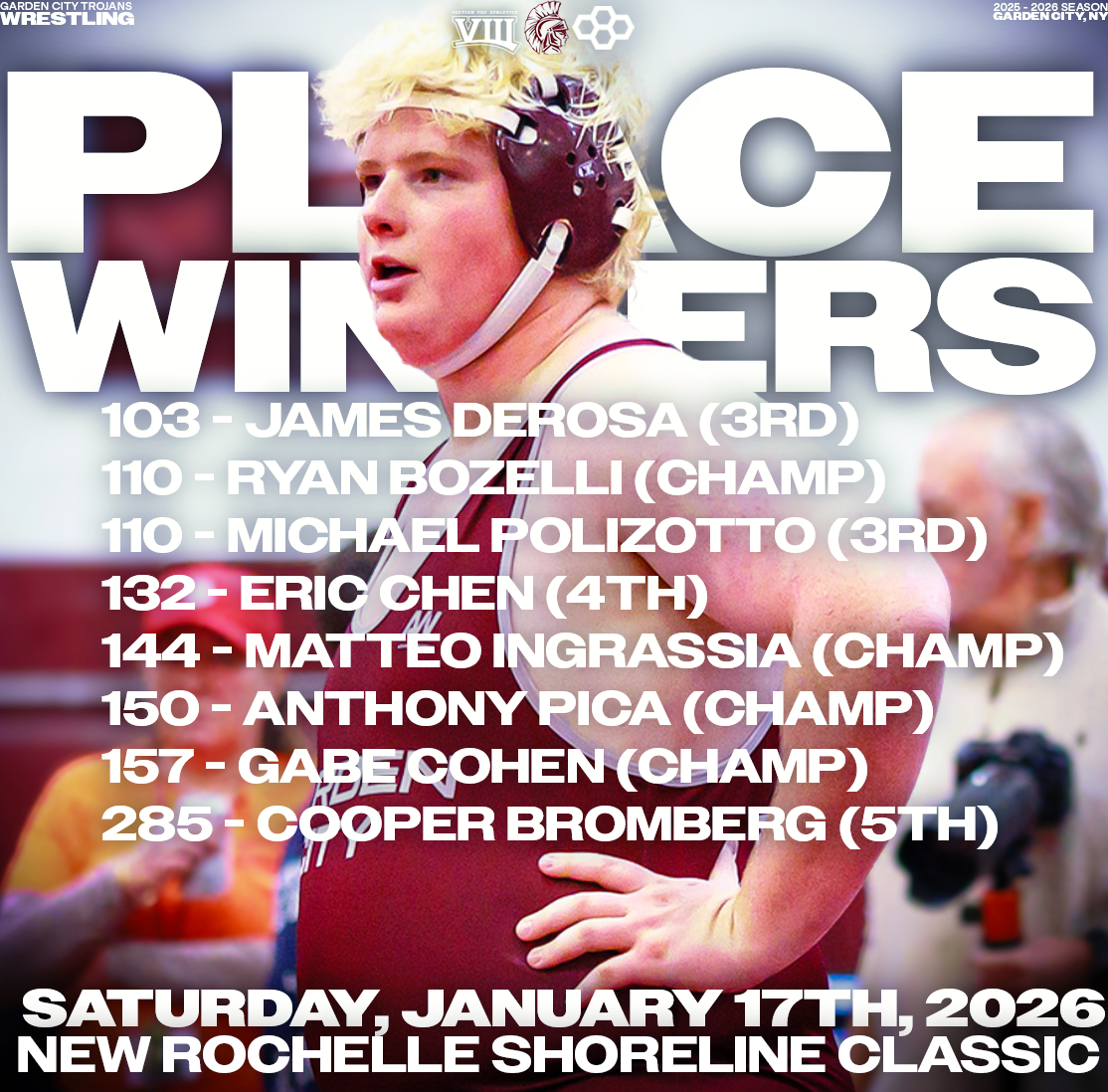 Explore a collection of social media graphics produced for the Garden City Trojans Wrestling team during the 2025-2026 season. The team made an appearance in the 2026 Nassau County Dual Meet Quarterfinals and had three All-County wrestlers: Seniors Anthony Pica & Gabe Cohen, and Junior Matteo Ingrassia. The Trojans are coached by second-year Head Coach Steve Jones and assisted by Matt Rich, James Murphy, Brad Hepworth, Michael Curiel, and Jayson Rivera.