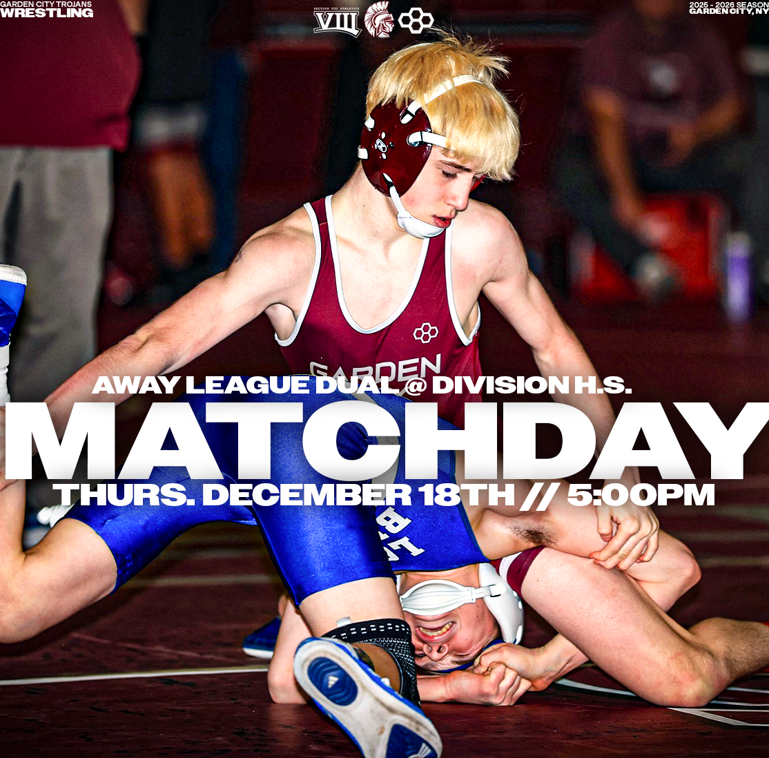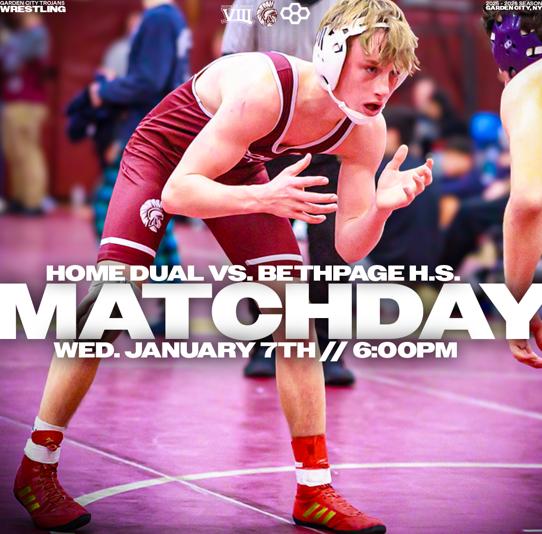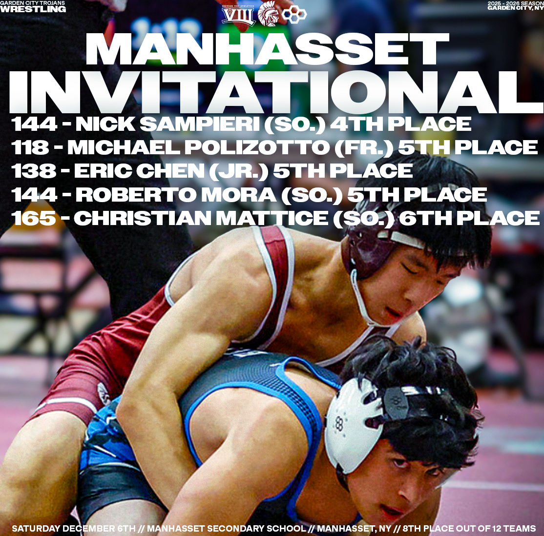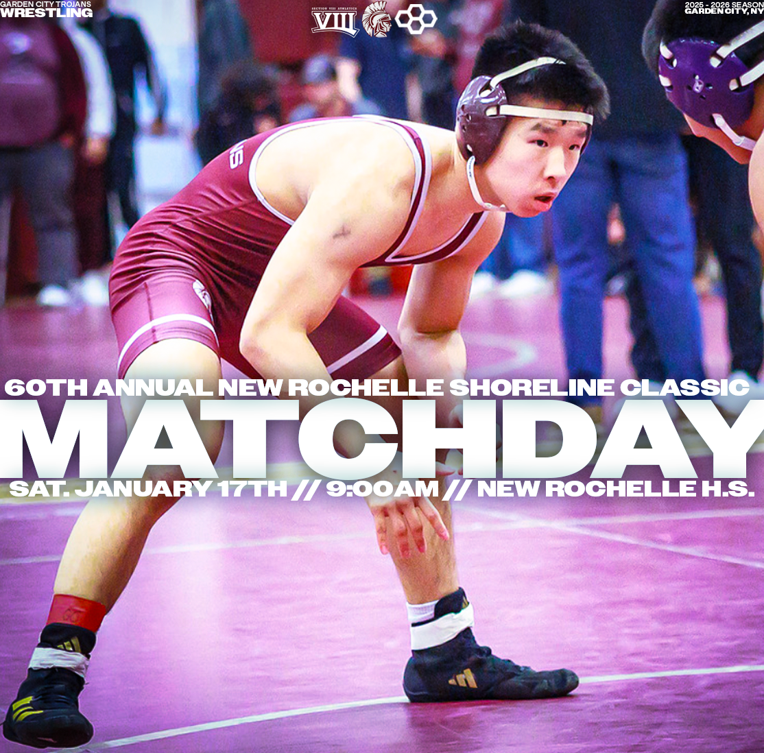 Explore a collection of social media graphics produced for the Garden City Trojans Wrestling team during the 2025-2026 season. The team made an appearance in the 2026 Nassau County Dual Meet Quarterfinals and had three All-County wrestlers: Seniors Anthony Pica & Gabe Cohen, and Junior Matteo Ingrassia. The Trojans are coached by second-year Head Coach Steve Jones and assisted by Matt Rich, James Murphy, Brad Hepworth, Michael Curiel, and Jayson Rivera.