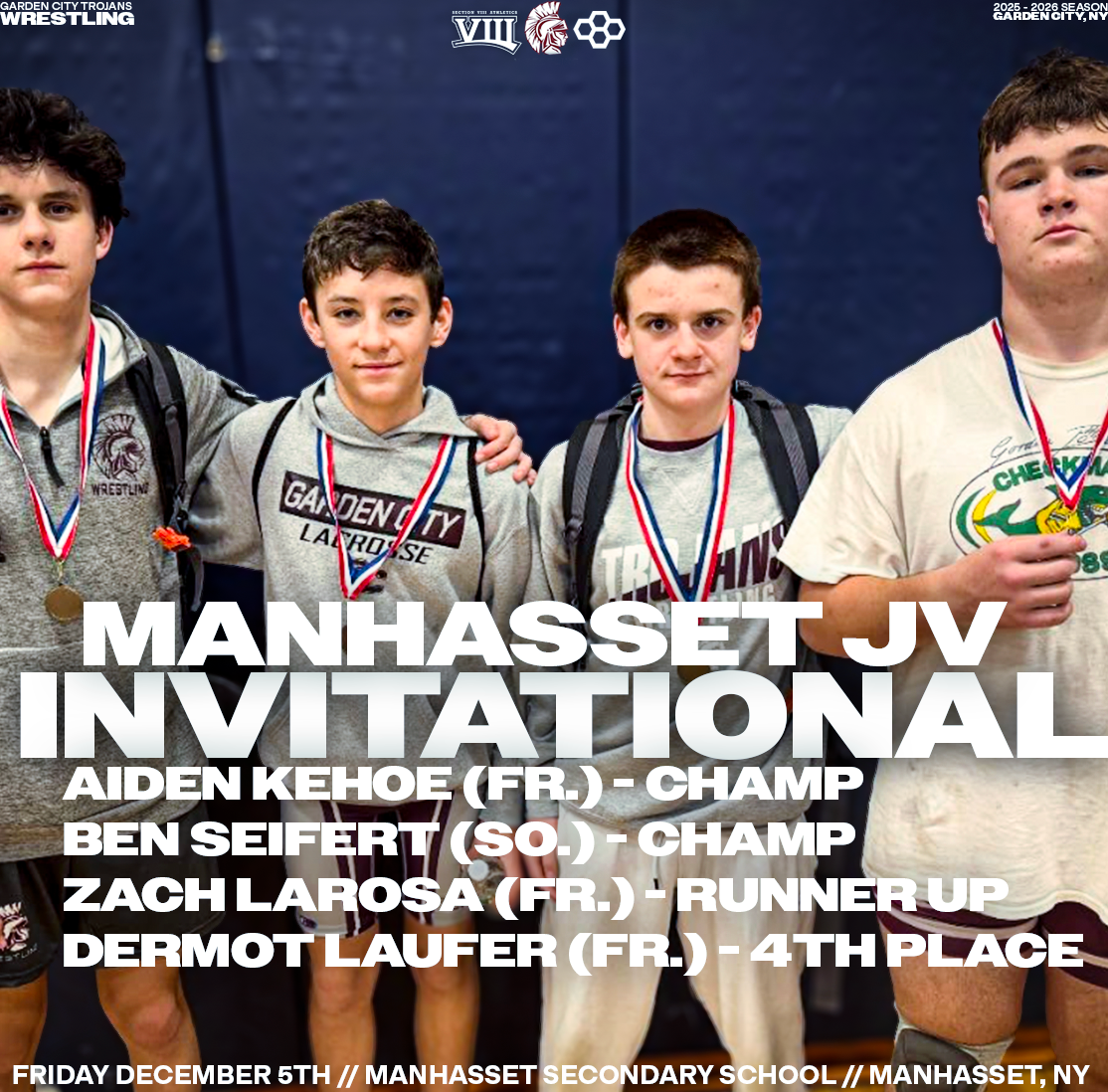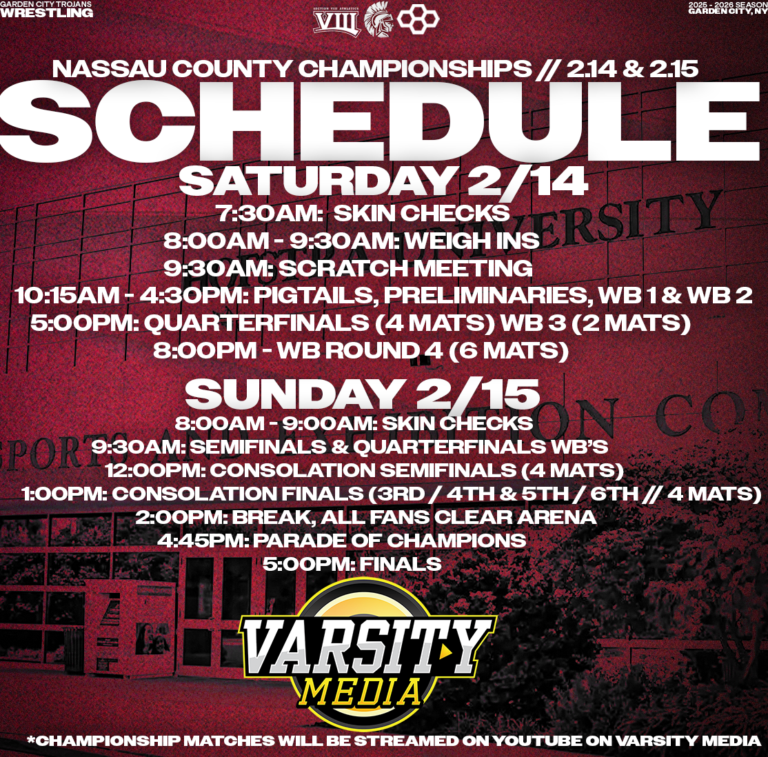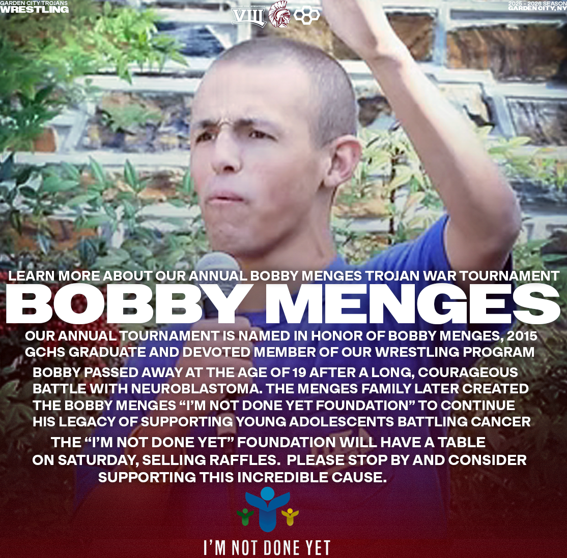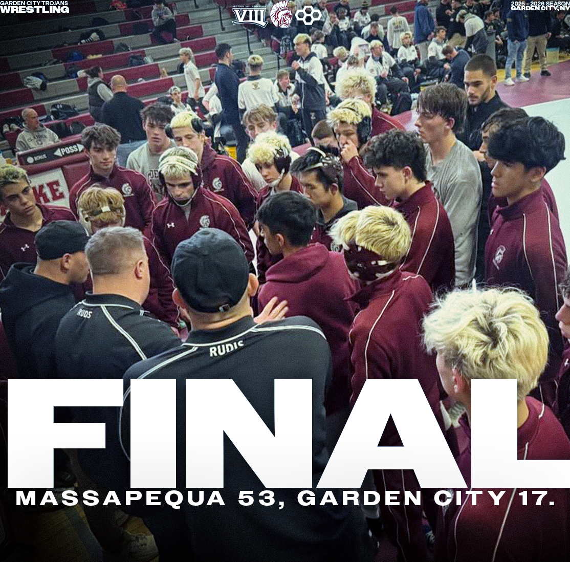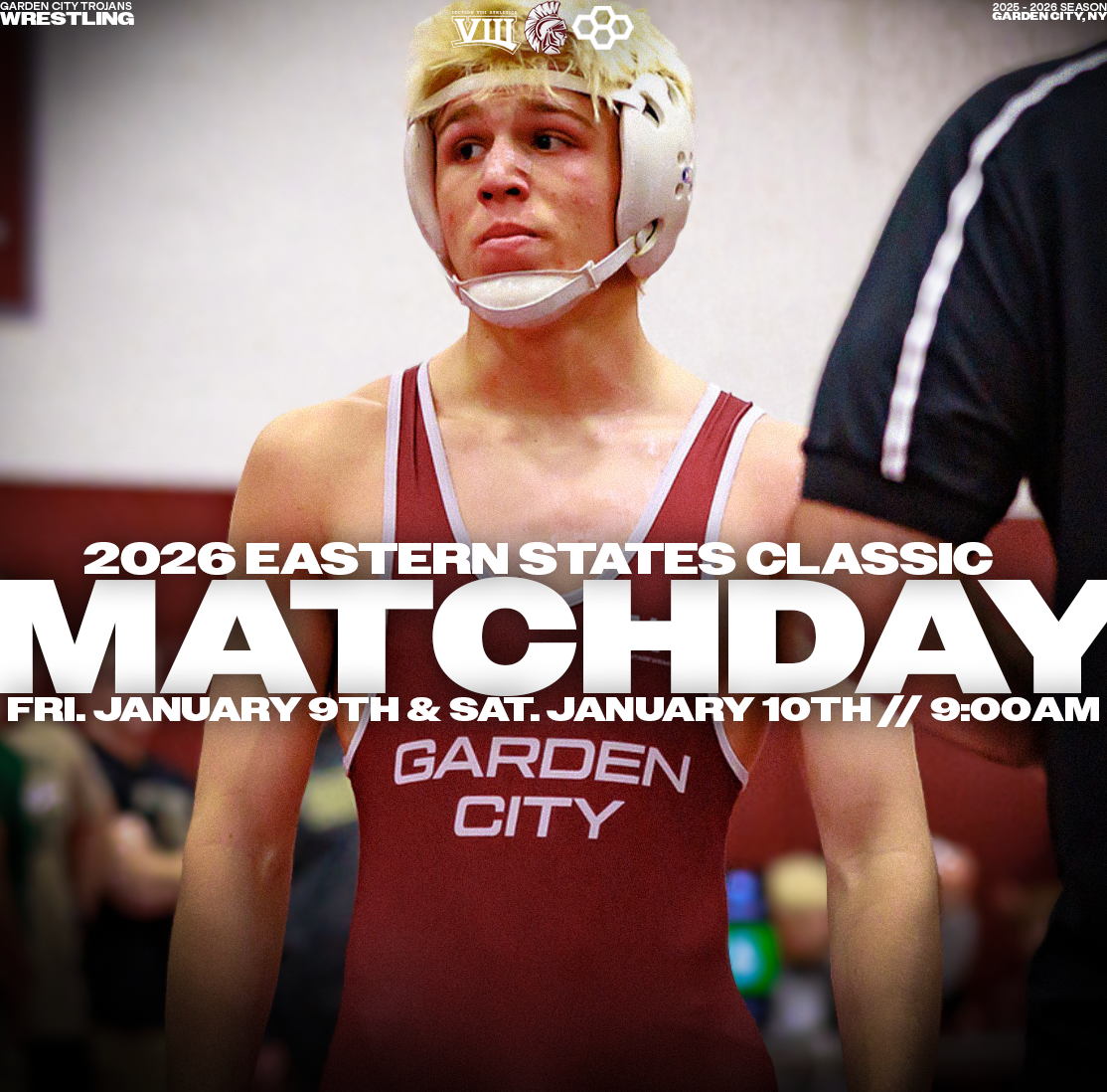 Explore a collection of social media graphics produced for the Garden City Trojans Wrestling team during the 2025-2026 season. The team made an appearance in the 2026 Nassau County Dual Meet Quarterfinals and had three All-County wrestlers: Seniors Anthony Pica & Gabe Cohen, and Junior Matteo Ingrassia. The Trojans are coached by second-year Head Coach Steve Jones and assisted by Matt Rich, James Murphy, Brad Hepworth, Michael Curiel, and Jayson Rivera.